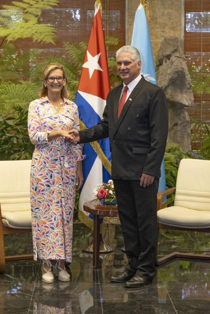 El Primer Secretario del Comité Central del Partido Comunista y Presidente de la República, Miguel Díaz-Canel Bermúdez, sostuvo en la mañana de este jueves un encuentro con Doreen Bogdan-Martin, secretaria general de la Unión Internacional de las Telecomunicaciones (UIT), a quien aseguró que es «un placer recibirla en Cuba».