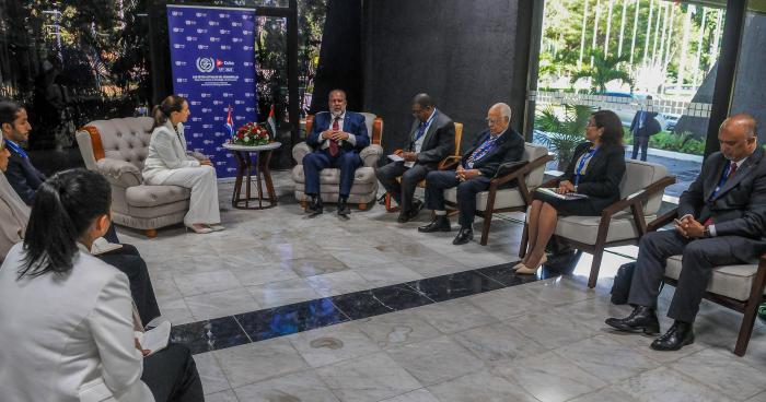 En una intensa jornada de diálogos, el miembro del Buró Político y primer ministro, Manuel Marrero Cruz, intercambió ayer con la ministra de Cambio Climático y Medio Ambiente de Emiratos Árabes Unidos, Mariam bint Mohammed Almheiri, quien encabeza la delegación de su país a la Cumbre del Grupo de los 77 y China, que sesiona hasta hoy en La Habana.