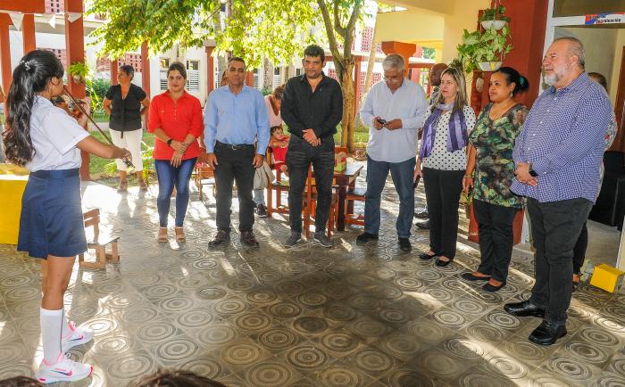 Acompañado por la gobernadora del territorio, Yanetsy Terry Gutiérrez; la titular de Educación, Naima Ariatne Trujillo Barreto; el viceministro de Cultura, Fernando León Jacomino, así como otras autoridades, el Primer Ministro recorrió áreas remodeladas de la EPA, las cuales garantizan mejores condiciones de vida y estudio a docentes y alumnos.