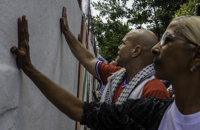 Para complementar el mural, varios de los participantes, entre ellos Gerardo Hernández, pintaron sus manos con los colores de la bandera de Palestina y plasmaron las huellas sobre un lado del muro, en representación de la condena del pueblo de Cuba a la guerra.