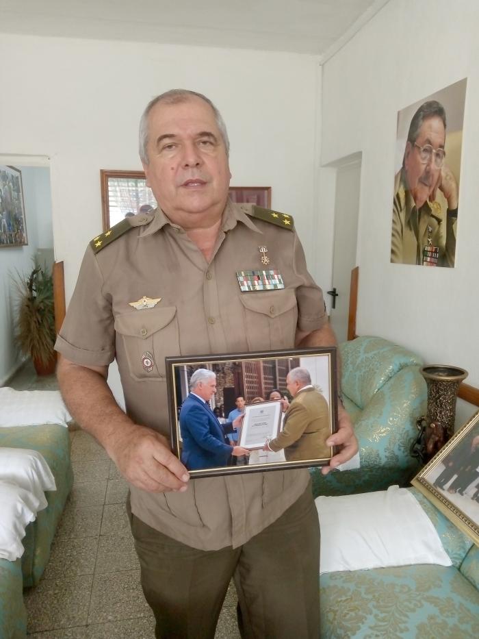 En su pequeño y sencillo despacho sobresalen las fotos de Fidel, el Che y Raúl. Distingue, además, una imagen en la que es reconocido con la Estrella del Servicio de Sacrificio, orden especial instituida por el Gobierno de Pakistán, para estimular a las personas e instituciones destacadas en la atención a las víctimas del terremoto de 2005.