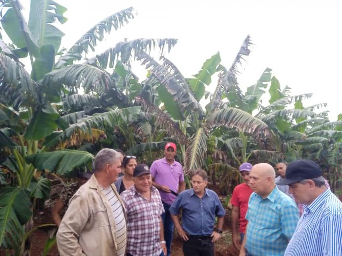 Al recorrer áreas de la UBPC La Rosita, Morales Ojeda apreció el buen estado de las plantaciones de maíz, con aceptables rendimientos, así como del plátano extradenso. Dijo que es preciso sembrar más cultivos rústicos, y no tener tierras vacías, sembrarlas todas, con riego o sin él.