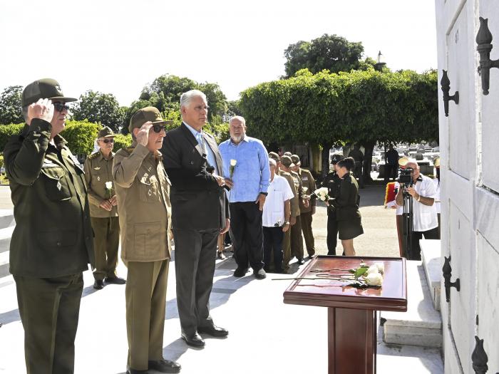 Solemne e íntimo resultó el tributo, salvas de fusilería, gratitud, silencio... Como colofón, Raúl y Díaz-Canel fueron los primeros en depositar rosas blancas cerca del nicho que protege ya los restos de tan distinguido cubano. Después, lo hizo el resto de los asistentes a la ceremonia, en la que se distinguían seis ofrendas florales: del General de Ejército, del Presidente de la República, de las Fuerzas Armadas Revolucionarias, del Ministerio del Interior, de la Asociación de Combatientes de la Revolución Cubana y de la familia.