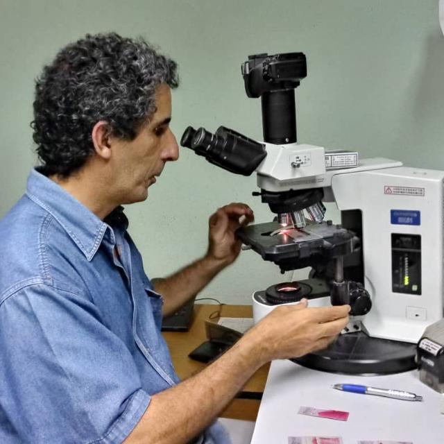 En el centro hospitalario casi siempre se le ve pegado a un microscopio, revisando las diferentes muestras de biopsias que llegan al departamento que dirige, o cerca del moderno laboratorio de inmunohistoquímica.