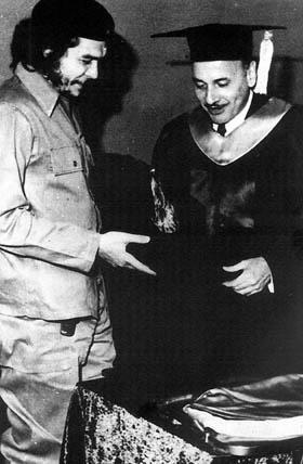 El Che, que vestía su clásico uniforme verde olivo y usaba su habitual boina negra, rematada por una estrella de bronce, llegó acompañado por el capitán Antonio Núñez Jiménez, profesor de Geografía de esa Universidad, y por el rector, doctor Mariano Rodríguez Solveira, prestigioso jurista y revolucionario, encargado de entregar la toga y el birrete que acreditaban a Guevara como Doctor Honoris Causa en Pedagogía.
