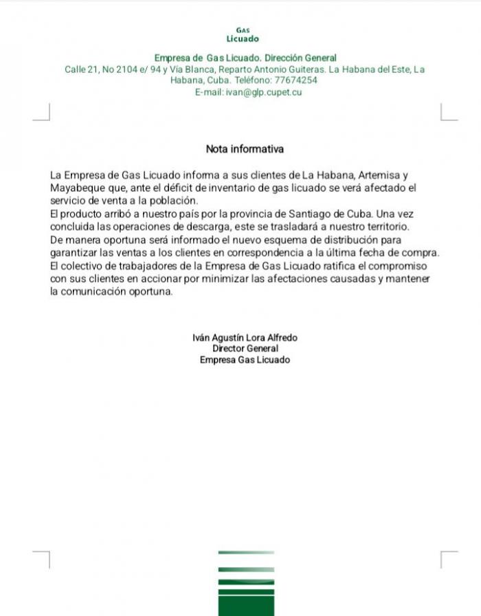 La Empresa de Gas Licuado informa a los clientes de estas provincias que ante el déficit de inventario de GLP se verá afectado el servicio de venta a la población