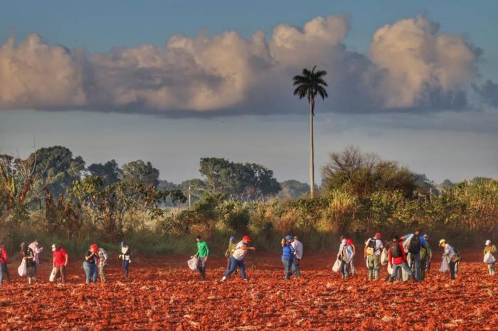 Las mañanas en el campo cubano son, por lo general, hermosas: la luz de la aurora se refleja en la tierra roja y el verde de las plantas de plátano, pero cuando a ese paisaje cotidiano se suman la laboriosidad, el entusiasmo, la alegría de compartir el surco con los compañeros durante un día de descanso, en función de sembrar alimentos; el cuadro de belleza natural se colma de la singularidad humana; y no cualquiera, sino la cubana, la que, en medio de muchas tempestades, sigue apostando por encontrar lo mejor del individuo.