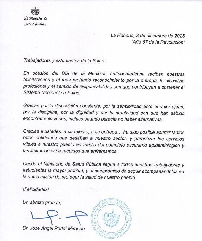 En ocasión del Día de la Medicina Latinoamericana reciban nuestras felicitaciones y el más profundo reconocimiento por la entrega, la disciplina profesional y el sentido de responsabilidad con que contribuyen a sostener el Sistema Nacional de Salud.