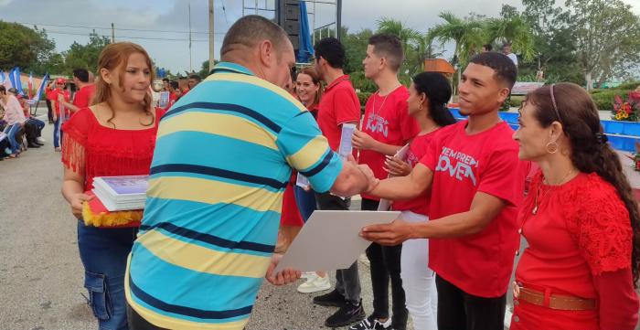 La cita, en la plaza Mario Aróstegui, fue también la confirmación de que la fuerza para la batalla económica y política está en la gente. Un grupo de camagüeyanos recibió con orgullo el carnet que los acredita como militantes de la Unión de Jóvenes Comunistas y del Partido Comunista de Cuba, incorporándose como savia nueva a la vanguardia de la Revolución.