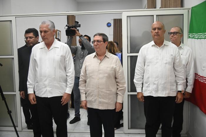 En la sede diplomática en La Habana, Díaz-Canel fue recibido por el embajador iraní Zabihollah Naderi, y estuvo acompañado en el sencillo homenaje por el canciller cubano, Bruno Rodríguez Parrilla, y el director general de Asuntos Bilaterales del Ministerio de Relaciones Exteriores, Carlos Miguel Pereira Hernández.