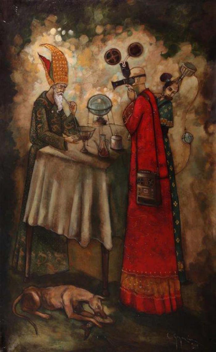 Formalmente utiliza aquí texturas de la misma pintura, es el empaste y el propio cuerpo de la materia el que transfigura otra dimensión o volumen, en el lugar que ocupaban en piezas anteriores esos “collages” que incorpora a las telas, llegados desde cualquier objeto o parte de él, que les imprime a sus creaciones un toque personal, otra historia añadida a la que narra. Carlos Guzmán atrapa las miradas desde estas evocaciones surrealistas, conformando un mundo sutil, plagado de objetos/artefactos que construye a partir de muchas otras, como híbridos de la imaginación que convocan experiencias vividas, toda una suerte de tesoro visual acumulado en los adentros que arma con paciencia. Y que regresan a la realidad pasados por el tamiz de su creatividad para regalarnos su mundo. Mostrándose, al final, como esos alquimistas, magos e investigadores que no son más que su sombra, esa que se inmiscuye en las telas con la luz que proyecta desde su interior.