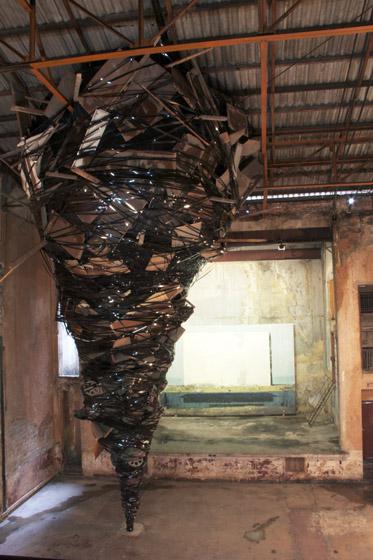 Una expo que partía —parte—, del compromiso con el espacio y sus alrededores, los vecinos y la historia del Águila de oro. De ahí piezas como Un chino llega a Matanzas…, de Susana Pilar, El año de la rata, de Garaicoa o Interior con huracán, de José Yaque, un tornado que arrastra consigo los escombros y despojos que poblaban el cine antes de ser convertido en galería.