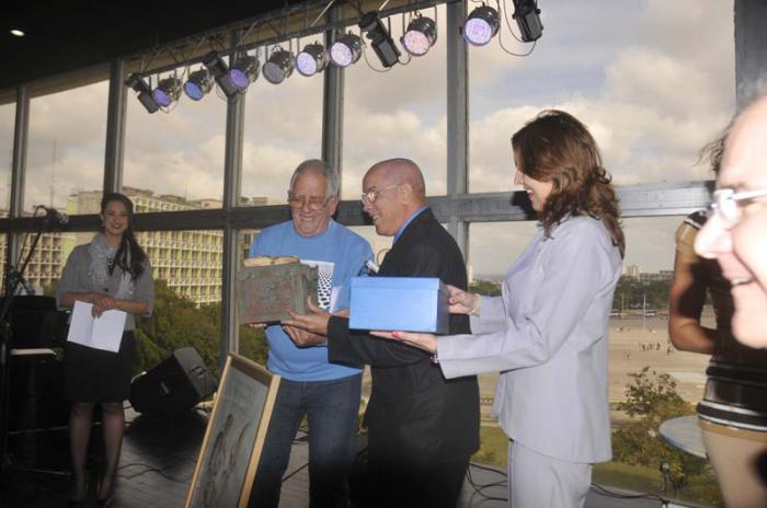 El periodista Joaquín Borges-Triana recibió este jueves el premio de Periodismo Cultural José Antonio Fernández de Castro, por la obra de toda la vida, de manos de Kenelma Carvajal, viceministra de Cultura y el crítico Guille Vilar, presidente del jurado.