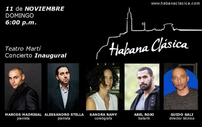 Domingo 11, 6:00 p.m., concierto inaugural de Habana Clásica. Invitados: pianistas Marco Madrigal y Alessandro Stela, coreógrafa Sandra Rami y bailarin Abel Rojo.