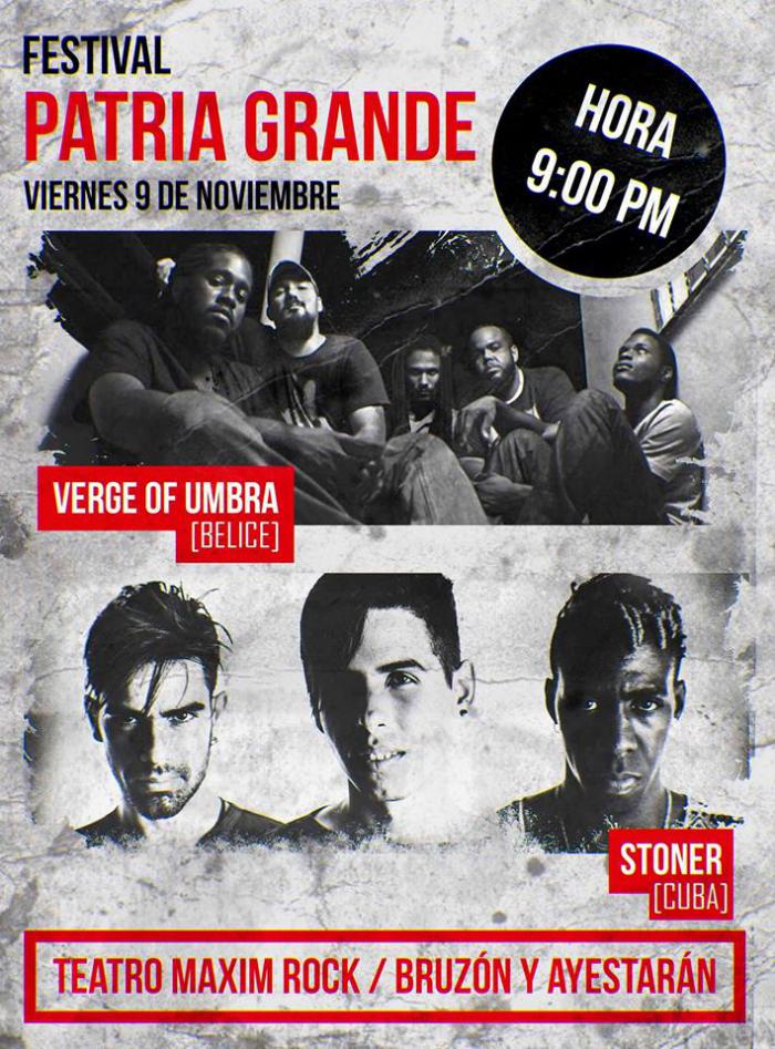 Viernes 9, 9:00 p.m., concierto de Verge of Umbra, de Belice y Stoner, de Cuba, como parte del Festival Patria Grande.