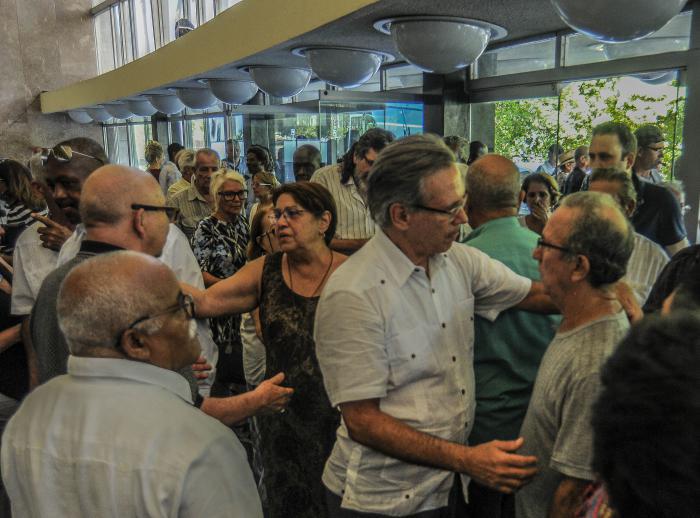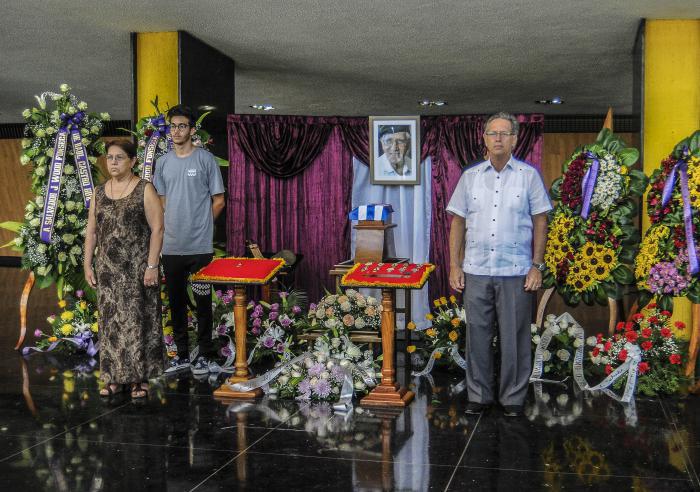 Un rostro y rosas blancas, resaltan en la Sala Avellaneda del Teatro Nacional. Junto a sus restos, la distinción de Héroe del Trabajo de la República de Cuba y las medallas Alejo Carpentier y Frank País. Lo acompañan por última vez su familia, los compañeros de vida, los amigos y admiradores de su obra. Según van llegando, muestran sus condolencias y tienen unas últimas palabras con él.