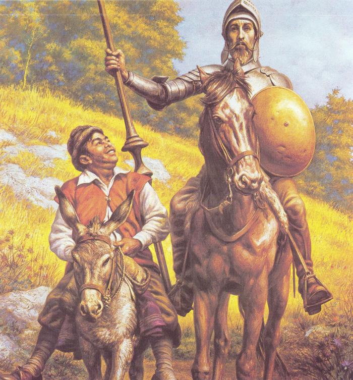 Cervantes comenzó convirtiendo la bacía de un barbero en la España «loca de riqueza», en yelmo dorado, y para el Quijote la bacía es yelmo. Si sabio fue el escritor de nuestra lengua, no lo fue menos su «ignorante» Sancho Panza, que deslumbró a su señor Don Quijote con una verdad sin límites. Le dijo Sancho un día: «A buena fe, señor, que no hay que fiar en la descarnada, digo en la muerte, la cual también come cordero como carnero; y a nuestro cura he oído decir que con igual pie pisaba las altas torres de los reyes como humildes chozas de los pobres. Tiene esta señora más de poder que de melindre; no es nada asquerosa: de todo come y a todo hace, y de toda suerte de gente, edades y preeminencias hincha sus alforjas. No es segador que duerme las siestas, que a todas horas siega…y aunque no tiene barriga, da a entender que está hidrópica y sedienta de beber a solas las vidas de cuantos viven, como quien se bebe un jarro de agua fría».