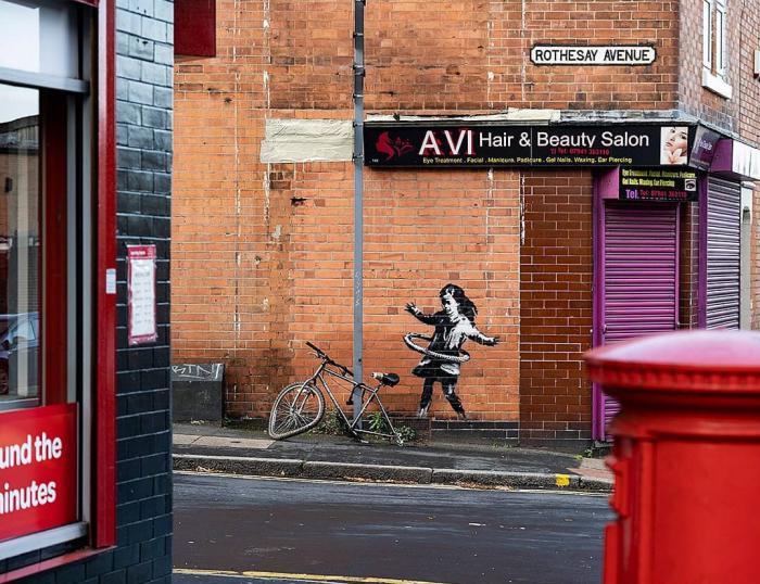 El famoso artista callejero Banksy ha confirmado la autoría de un grafiti que recientemente apareció en la pared de una peluquería en la ciudad británica de Nottingham. El mural muestra a una niña jugando al «hula hoop» con un neumático de bicicleta cerca de una bici real sin la rueda trasera.