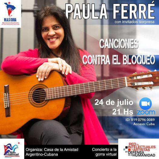Paula Ferré, trovadora argentina, realizó un concierto virtual junto a otras voces, dedicado especialmente a Cuba. Transmitido en vivo desde la plataforma de zoom, canciones latinoamericanas de amor fueron protagonistas en esta cita sonora.