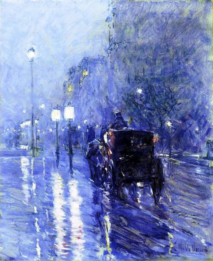 De vuelta al otoño que invocó, en 1890, como medianoche lluviosa, Childe Hassam, en un cuadro memorable. Perfecta historia de carruaje, luces urbanas y la tentación del refugio en forma de ventanas iluminadas que invitan al cobijo. En tales calles newyorkinas, que Hassam pintó en la última década del siglo xx, caminó nuestro mártir. Noches tranquilas no tuvo y, a pesar de ello, noches fueron de quietud angustiosa. El alma trémula y sola / padece al anochecer. Fuera Otero o fuera Carmencita, en ese angustioso 1890, él tuvo al menos una noche de sosiego. «El teatro, ávido, aplaude: las mujeres se muerden los labios; los hombres se echan sobre el espaldar del vecino; se oye el taloneo, el barrido, el punteo de aquel pie de cisne que borda en las tablas. Y cuando se va, desganada y perezosa, parece que se ha ido un rayo de sol».