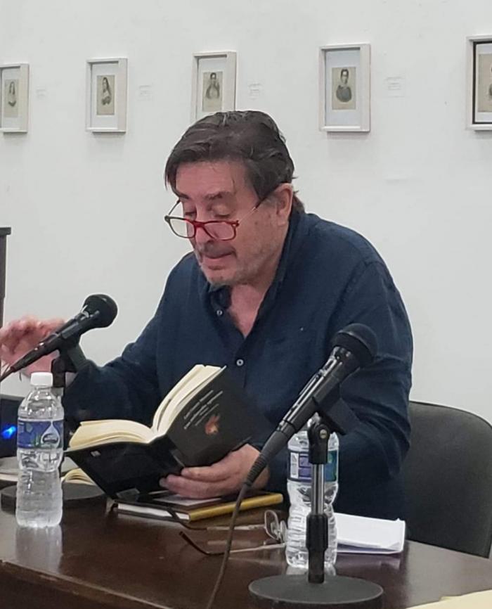 Dos charlas efectuó el intelectual en la Facultad de Lenguas de la institución, en las que realizó un análisis impecable de carácter social, mientras en el exterior, tal cual relata el periodista Pedro Solans para el Diario de Carlos Paz: «argentinos se colocan pollitos amarillos en su cabeza para recibir a Milei».