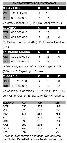 Todo lo contrario es el panorama de los dos últimos conjuntos, ocupantes de los puestos séptimo y octavo. Los Piratas de la Isla marcan más veces que santiagueros y artemiseños, pero sus monticulistas han soportado 356 carreras, punteros en este negativo departamento. Por el estilo andan las Avispas de Luis Danilo Larduet, cuya ofensiva no es la que se esperaba —sobre todo con la prolongada ausencia de Despaigne, ya incorporado, y Alexei Bell—, y sus tiradores ocupan el segundo lugar a la hora de recibir anotaciones.