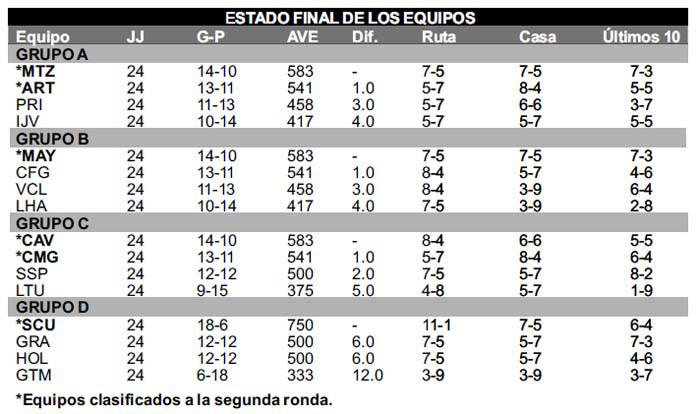 Artemisa, Cienfuegos y Camagüey concluyeron con idéntico balance de 13 triunfos y 11 descalabros, pero a la postre Cazadores y agramontinos permitieron menos carreras que los sureños y se llevaron los boletos.