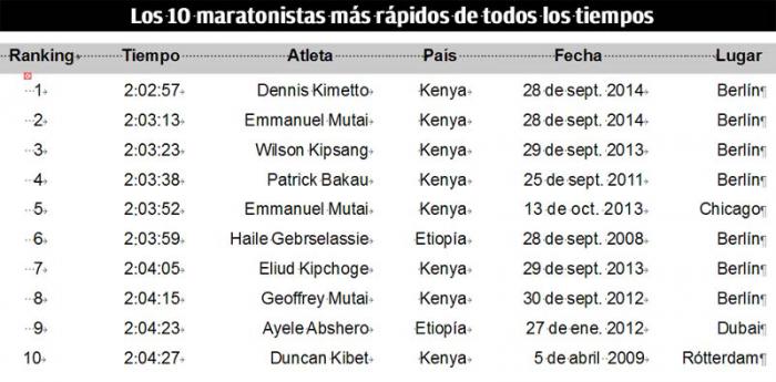 Hasta ahí todo normal, si no fuera porque el pasado domingo al kalenjin Dennis Kipruto Kimetto le dio por romper, con un tiempo de 2:02:57, la barrera de las dos horas y tres minutos, afeitándole 26 segundos a la anterior plusmarca establecida un año atrás por su compatriota Wilson Kipsang (2:03:23) precisamente al final de los tilos de Ünter den Linden.