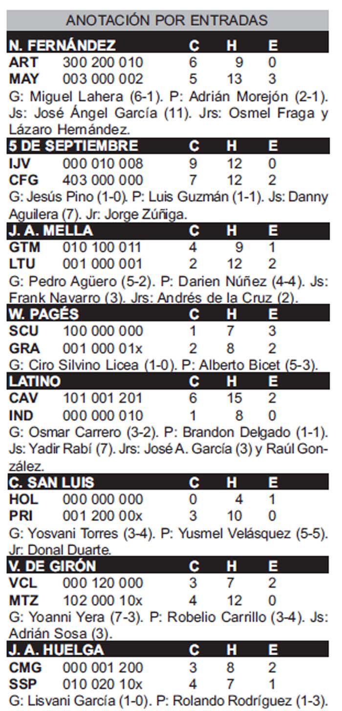 Seis carreras de diferencia a favor de los locales exhibía el pizarrón del 5 de Septiembre cuando, a tres outs del final, se desplomó el pitcheo de los sureños que hasta ese momento había mantenido a raya a sus rivales. Fueron en total cuatro sencillos, un doblete, tres transferencias —dos de ellas con las bases llenas—, un error y un elevado de sacrificio.