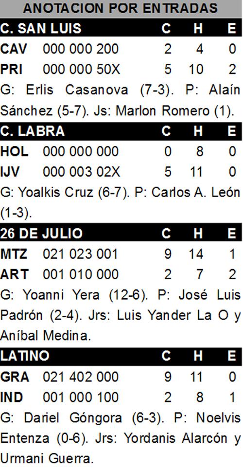 De nuevo el relevista Yaisel Sierra no pudo controlar sus envíos y otorgó un boleto con la casa llena para abrir el marcador, y después llegaron las oportunas conexiones de Alfredo Rodríguez y el capitalino Jorge Luis Barcelán, ardiendo con el madero en las últimas fechas.