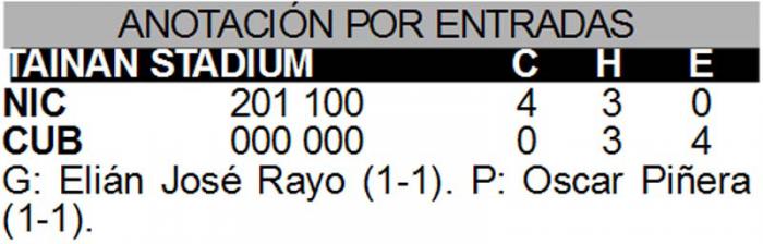 Elián José Rayo, el abridor nicaragüense, le hizo honor a su apellido pues resultó una tormenta para los bateadores cubanos, repartiendo nueve ponches con tres bases por bolas y un solitario imparable, de Ramírez en el segundo acto. En total tiró 85 pelotas hacia el plato antes de ser sustituido por Emilio Rostrán, quien a pesar de aceptar un par de sencillos se las arregló para colgar el último cero, con un ponche propinado.