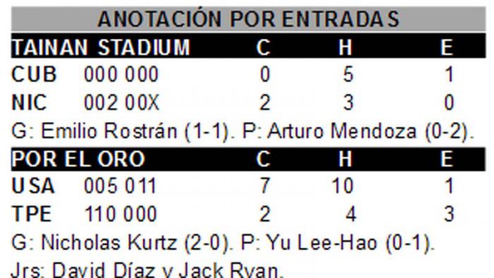 En el partido por la medalla de oro —presenciado por más de 11 000 aficionados en el estadio municipal de Tainan—, Estados Unidos iba debajo en el marcador ante los anfitriones de la justa, 0-2, pero en el tercer acto se soltaron a batear y no pararon hasta fabricar un racimo de cinco con un sencillo, tres dobletes y cuadrangular del torpedero y cuarto bate David Díaz, líder de los bateadores con promedio de 571. El margen resultó suficiente para que Nicholas Kurtz lanzara cinco entradas estrucando a seis rivales.