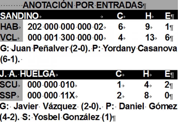 Con el choque igualado a cuatro, los ahora finalistas del certamen marcaron las dos decisivas, ya con un par de outs en el pizarrón del Sandino, por doblete de Alfredo Calderón, un boleto intencional a Hasuan Viera y un par de errores del antesalista Yoan Palacios sobre el roletazo de Ariel Echevarría, todo a costa del relevista Yordany Casanova, de buena labor durante dos entradas y un tercio. Calderón, Viera y Echevarría anotaron dos carreras cada uno y Andy Pacheco remolcó dos con un tubey en el tercer capítulo.