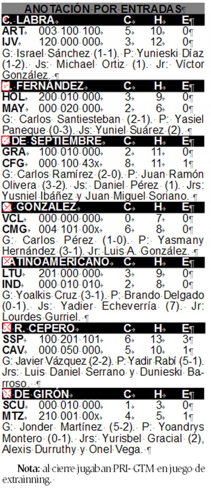 Siete anotaciones marcaron los sureños en el tercio final, con aporte decisivo de los experimentados Juan Miguel Soriano, Yusniel Ibáñez y Juan Miguel