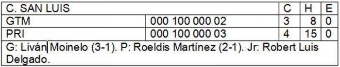 Por último, Holguín cumplió y derrotó al sotanero Mayabeque, apoyado en la buena faena monticular de Carlos A. Santiesteban y Yuniel Suárez y oportuna producción de Michel Gorguet, Yeison Pacheco y José A. Castañeda, todos con un remolque.