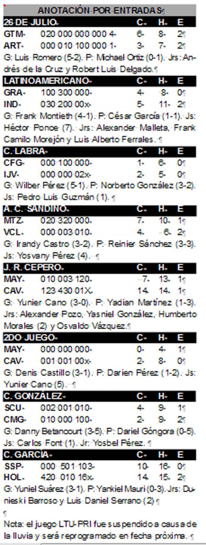Hubo dos barridas más, además de la de los Tigres. Una tuvo como escenario el Labra, en un buen duelo de zurdos entre el pinero Wilber Pérez y el olímpico Norberto González. Ganó el primero que estuvo ocho capítulos en el montículo con seis jits aceptados antes de darle paso al cerrador Pedro Luis Guzmán. Las dos del octavo para los locales por boleto, sacrificio, sencillo de Rigoberto Gómez al central, elevado de sacrificio de Luis Felipe Rivera y decisivo sencillo de Ariel Echevarría sobre un envío del relevista Carlos Ramírez. Los actuales subcampeones se afianzaron en la sexta plaza de la tabla de posiciones.