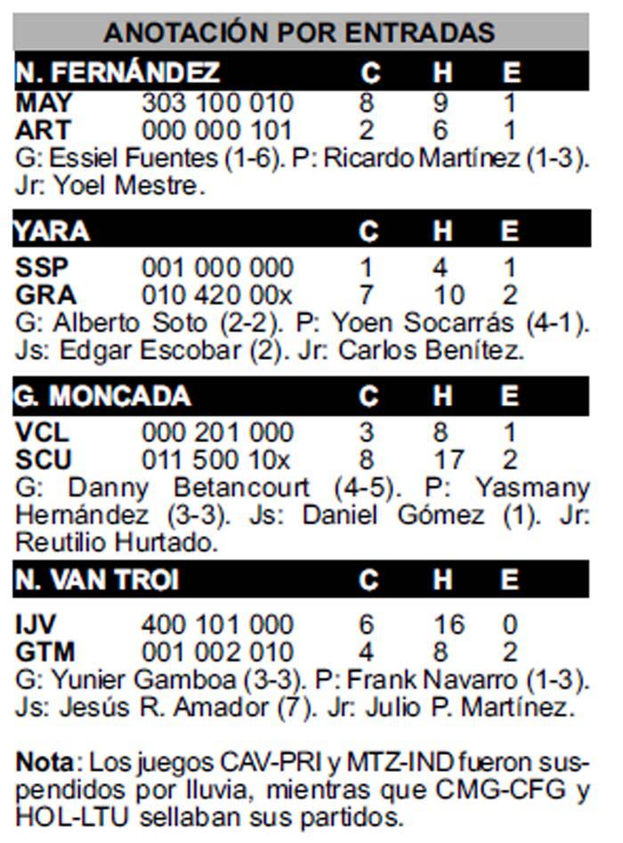 Por último, en choque de colistas Mayabeque derrotó a Artemisa por segunda fecha al hilo, ahora con sólida labor del novato Essiel Fuentes durante siete episodios, en los cuales solo permitió cuatro jits y una limpia. Madero en ristre, Yoel Mestre se presentó en tarde de gala con dos anotadas, tres impulsadas y un jonrón.