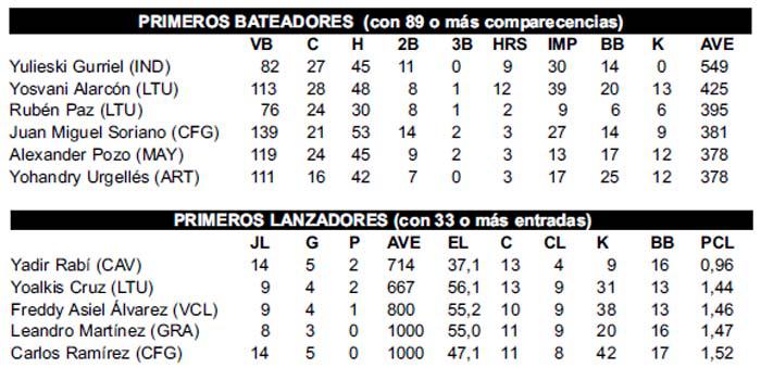 Dos granmenses, Roel Santos (33) y Adrián Moreno (32) andan luchando el liderato de carreras anotadas… El santiaguero Maykel Castellanos es el nuevo líder en jits, 59, tres más que el industrialista Stayler Hernández… Luego de conectar cuatro jonrones en la jornada del lunes el receptor tunero Yosvani Alarcón suma ya una docena y es, además puntero en total de bases (94), veces que impulsa el empate o la ventaja, 12, y segundo en average de bateo, 425 y slugging, 832…Y esto es todo por hoy. Nos vemos en el estadio.