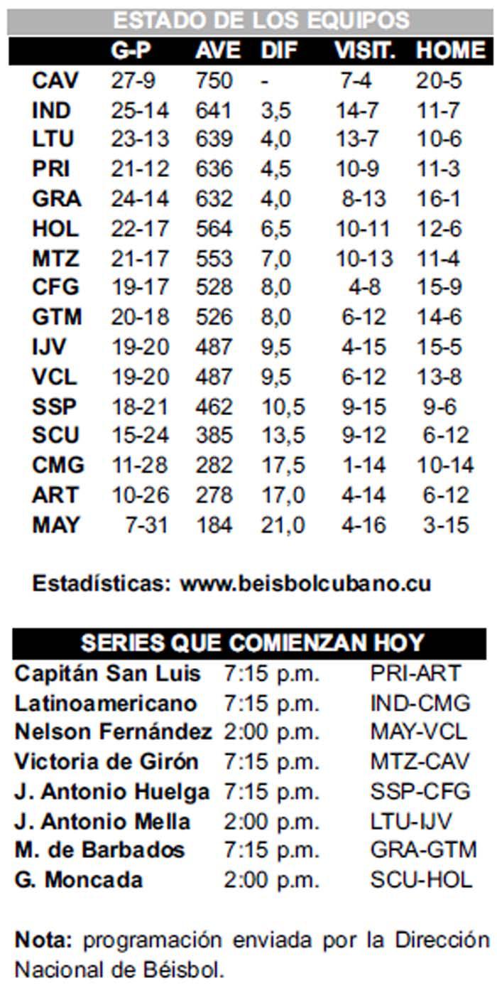 Gracias a la lluvia de los últimos días, el estado de los equipos se ha complicado sobremanera. Usted verá a Pinar del Río en cuarto lugar, a cuatro juegos y medio del líder, y a Granma en quinto, a cuatro. No es un error. Los equipos se colocan uno detrás del otro en función del average y los pinareños—con seis desafíos suspendidos—, acumulan dos derrotas menos que los Leñadores, por lo que a la hora de dividir las victorias entre el total de partidos efectuados el resultado es el que usted aprecia en el estado de los equipos: cuatro milésimas a favor de Pinar, 636 por 632. Por supuesto, esos encuentros hay que efectuarlos y se abrirá un compás de espera hasta que finalice el receso por el Premier 12, con grandes posibilidades de sorpresas, pues entre Matanzas, ocupante del séptimo escaño, y el binomio Isla-Villa Clara, empatado en los puestos 10-11, la diferencia es de solo 2,5 juegos. Si seguimos observando la tabla nos daremos cuenta de que, por ejemplo, Ciego de Ávila lleva 25 encuentros en su patio y Sancti Spíritus solo 15. Problemas del calendario, como lo es también que este sábado de nuevo no habrá juegos. De última hora, Antonio Díaz Susavila, vocero de la Federación Cubana de Béisbol, confirmó que Las Tunas será la sede del Juego de las Estrellas de la presente temporada, los días 5 y 6 de diciembre.