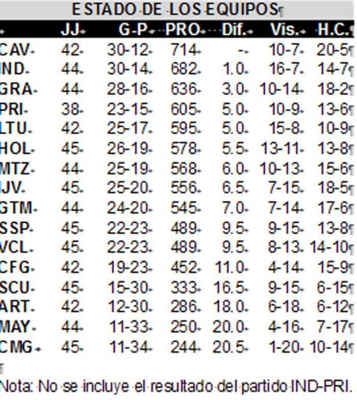 *Balance de Clasificación de Equipos: se calcula dividiendo las carreras anotadas entre los innings a la ofensiva, menos las carreras permitidas entre los innings a la defensiva. Dicha fórmula arroja un índice, y el equipo de mayor índice ocupará la mejor posición.