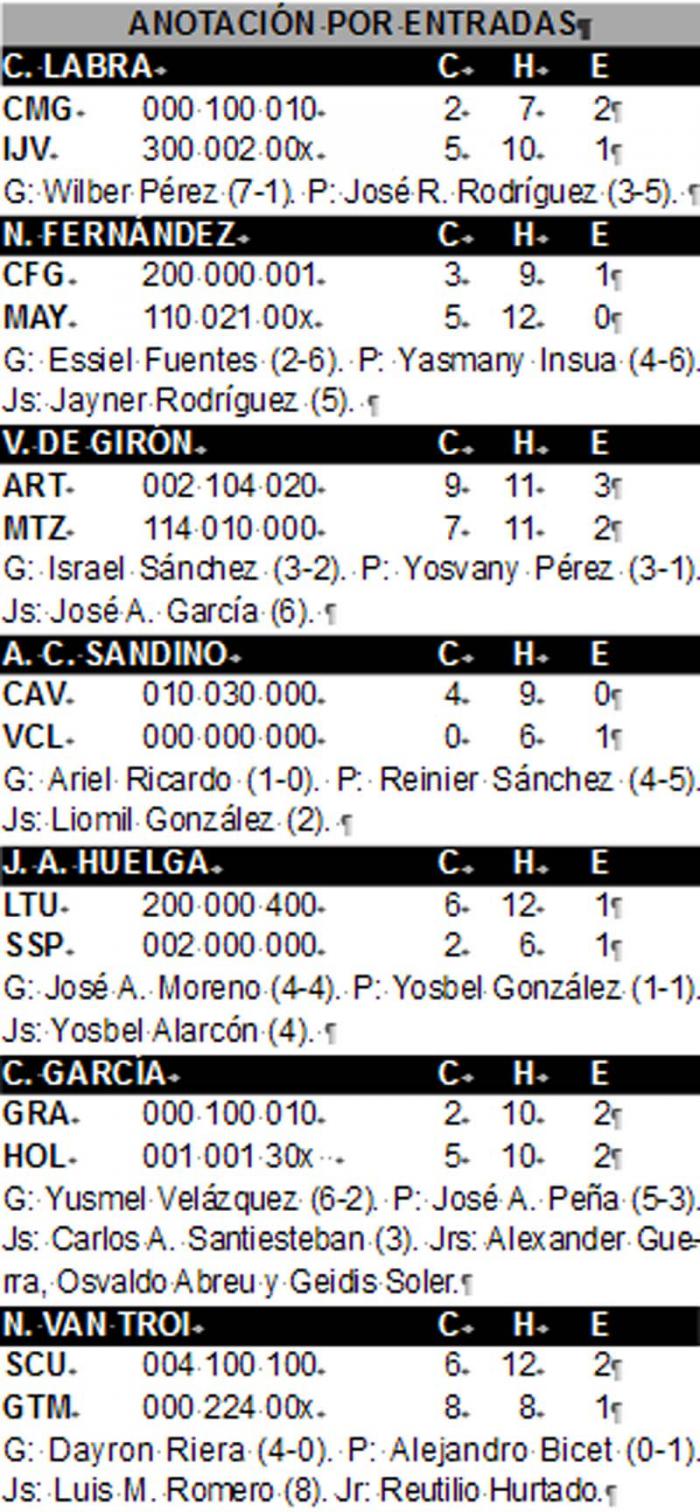 El mentor Noelvis González apostó por su mejor carta, el derecho Yusmel Velázquez, quien no lo hizo quedar mal y solo permitió una limpia contra los granmenses, muy bien respaldado por el relevo de Carlos A. Santiesteban, intransitable en el epílogo. Con esta victoria los holguineros llegaron a 26 sonrisas y no tienen necesidad de esperar por ningún resultado.