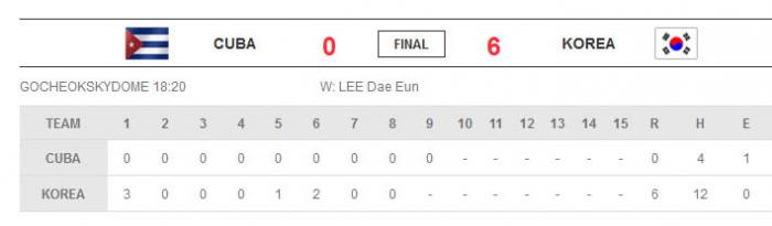 Los coreanos desplegaron una potente ofensiva de 12 imparables frente a seis lanzadores cubanos y a la defensa no cometieron errores, mientras que sus rivales fueron reducidos a cuatro indiscutibls y pifiaron en una ocasión. La victoria fue para Dae-eun Rhee y el revés a la cuenta del zurdo abridor Yoanni Yera Montalvo.