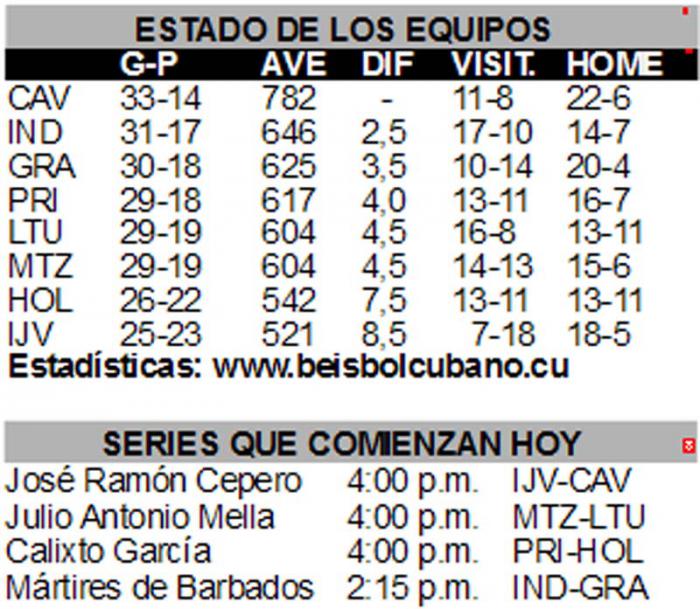 —Holguín y Matanzas acumulan seis pifias cada uno—, y el average general es de 970, muy bajo para una etapa élite. Ojos y oídos estarán pendientes de lo que suceda en el duelo de invictos en el Mella y en el Industriales-Granma, en Bayamo, independientemente de que tanto los Cachorros holguineros como los pineros están obligados a ganar si no quieren estar al borde de la virtual eliminación. Esta fase es un evento de distancia corta.