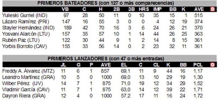 RÁPIDAS: El industrialista Stayler Hernández está al frente en los departamentos de carreras anotadas (42), jits (70, empatado con Maikel Castellanos, refuerzo de Granma) y dobletes (16), además de ser segundo en total de bases (111, una menos que el tunero Yosvani Alarcón)…El holguinero Yunior Paumier encabeza los casilleros de bases por bolas (50) y bases intencionales (20)… Los jonrones suman 454, de ellos 64 en el segundo inning, 23 con las bases llenas y 289 por el jardín izquierdo, dos conectados por emergentes y solo uno dentro del terreno…El matancero Yoanny Yera es el puntero en ponches (60) y Ian Rendón (IND) en bases por bolas (37)…Y nada más por hoy. Nos vemos en el estadio.