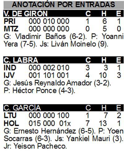 No fue tarde de bateadores la de este jueves, con los lanzadores crecidos especialmente en el Victoria de Girón, mientras el choque entre Industriales y la Isla encontró decisión por la mínima en el noveno cuando los Piratas dejaron al campo a sus rivales y ganaron la subserie luego de caer en el primer juego.
