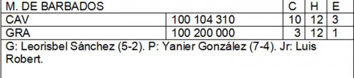 Leonardo Urgellés entró en circulación por error del torpedero Jorge Alomá y llegó hasta la antesala por el doblete de Rodny Proenza, batazo que sacó del box al cerrador Héctor Ponce, sustituido por Juan Xavier Peñalver. Este logró sacar dos outs, con una base intencional, pero no pudo evitar la línea de Dainier Gálvez al bosque derecho para remolcar la de la victoria.