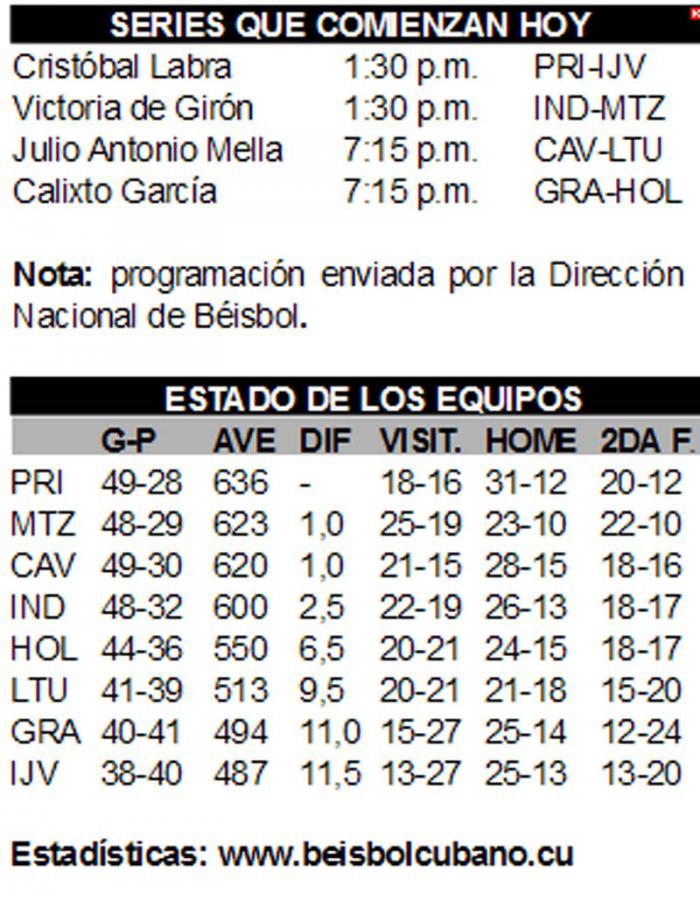 Mala suerte para los amantes de pronósticos. Tres equipos separados por un juego, un cuarto a solo dos y medio y un quinto que aún tiene posibilidades. El miércoles 2 de marzo termina el calendario oficial, pero aún restarán partidos por efectuar: a Pinar y Matanzas les faltan cuatro, tres a la Isla, dos a Ciego de Ávila y uno per cápita a Industriales, Holguín y Las Tunas. Imposible dar un favorito. En el béisbol cualquier cosa puede suceder.