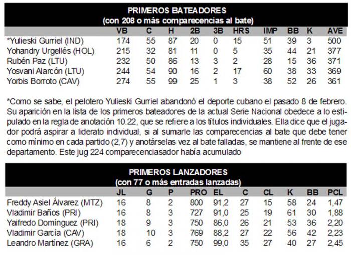 RÁPIDAS: Stayler Hernández es el líder en jits (105), dobles (25, empatado con Yorbis Borroto), comparecencias (380, igualado con Roel Santos), carreras anotadas (66) y total de bases (172)…Guillermo Avilés marcha al frente en veces que impulsa empate o ventaja, 22, seguido por Alexander Malleta y Yosvani Alarcón, 19…Osvaldo Vázquez tiene el mejor promedio de bases alcanzadas por jit conectado, 1,84… Yoanni Yera es el único lanzador con más de 100 ponches, 106 en total…Y hasta aquí. Nos vemos en el estadio.