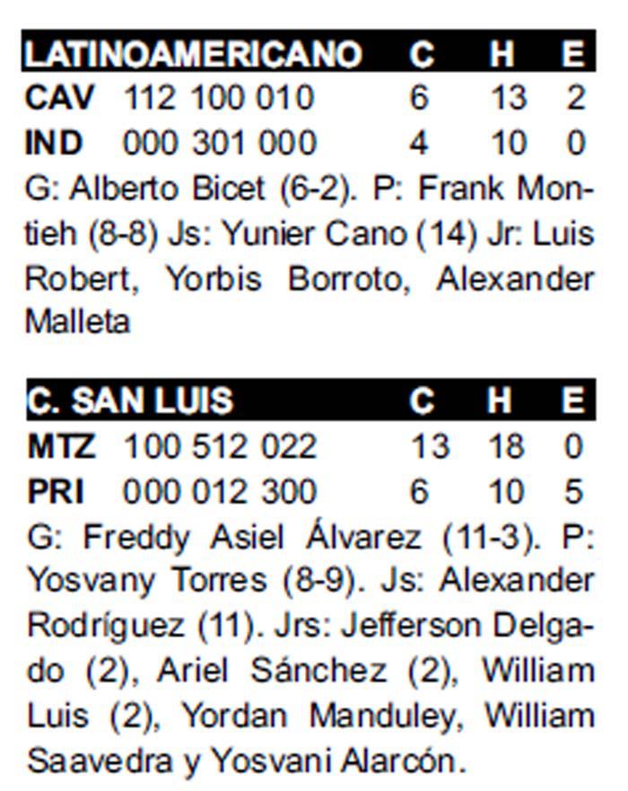 En la sexta vino el relevo de los Tigres, un inefectivo Leoribel Sánchez, pero el timonel visitante corrigió a tiempo y subió al diestro Yander Guevara, quien sacó los tres outs, aunque el contrario pisó una vez más la goma por elevado de sacrificio del emergente Juan C. Torriente. Y desde el séptimo, con el juego por la mínima, el supersónico Yunier Cano se encaramó en la trinchera de los monarcas para cortarle el agua y la luz a los parciales capitalinos que no dejaron de apoyar a los suyos.