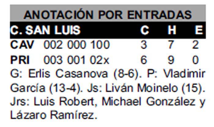 Erlis caminó seis y un tercio, con cinco ponches, un solitario boleto y dos limpias a su cuenta, auxiliado en las postrimerías por el zurdo Liván Moinelo, quien solo titubeó por un largo batazo de Fiss, el mismo hombre que le definió el segundo encuentro.